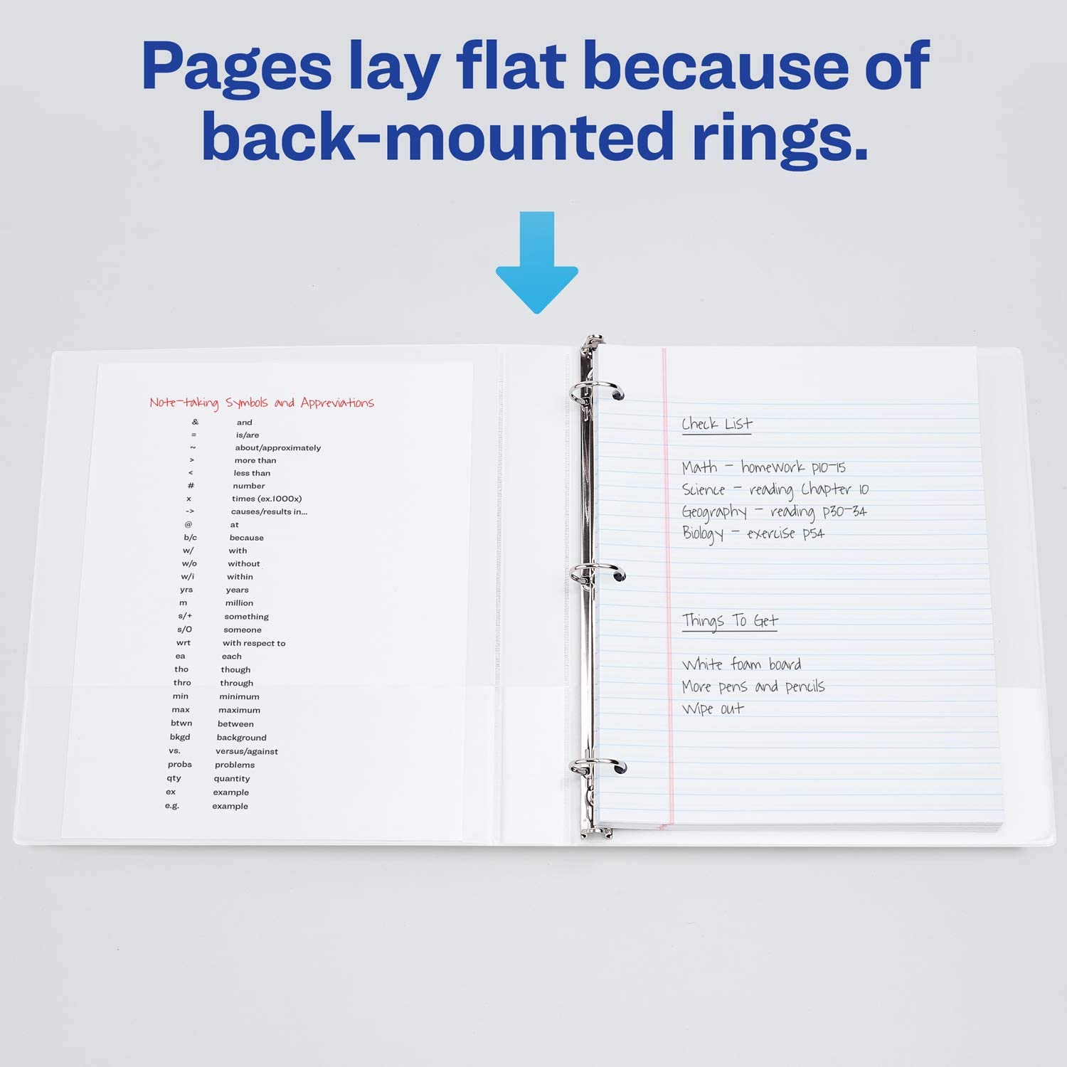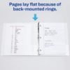 - Pages lie flat because rings are mounted on the rear binder panel instead of on the spine