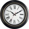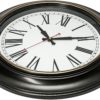 Decorate and enhance any room with this beautiful extra large wall clock. Dark brown frame, black roman numerals and decorative hands on a white background create easy viewing from every angle Silent non-ticking mechanism with sweeping movement. Precise quartz movements guarantees accurate time all day! Extra large – 18 inches in diameter. Its timeless design it great for a living room, bedroom, kitchen, guest room, family room, office, restaurant, or above a fireplace Premium glass cover to ensure protection from dust and debris. Quality deep brown plastic frame makes it look like wood but is lightweight and easy to hang. Red second hand for extra clarity. Contemporary Matte finish Large nail slot offers easy no-fuss and fast installation. Uses 1 “AA” battery – not included (Note: Plus side of battery should be inserted first) 1-Year Manufacturer Warranty