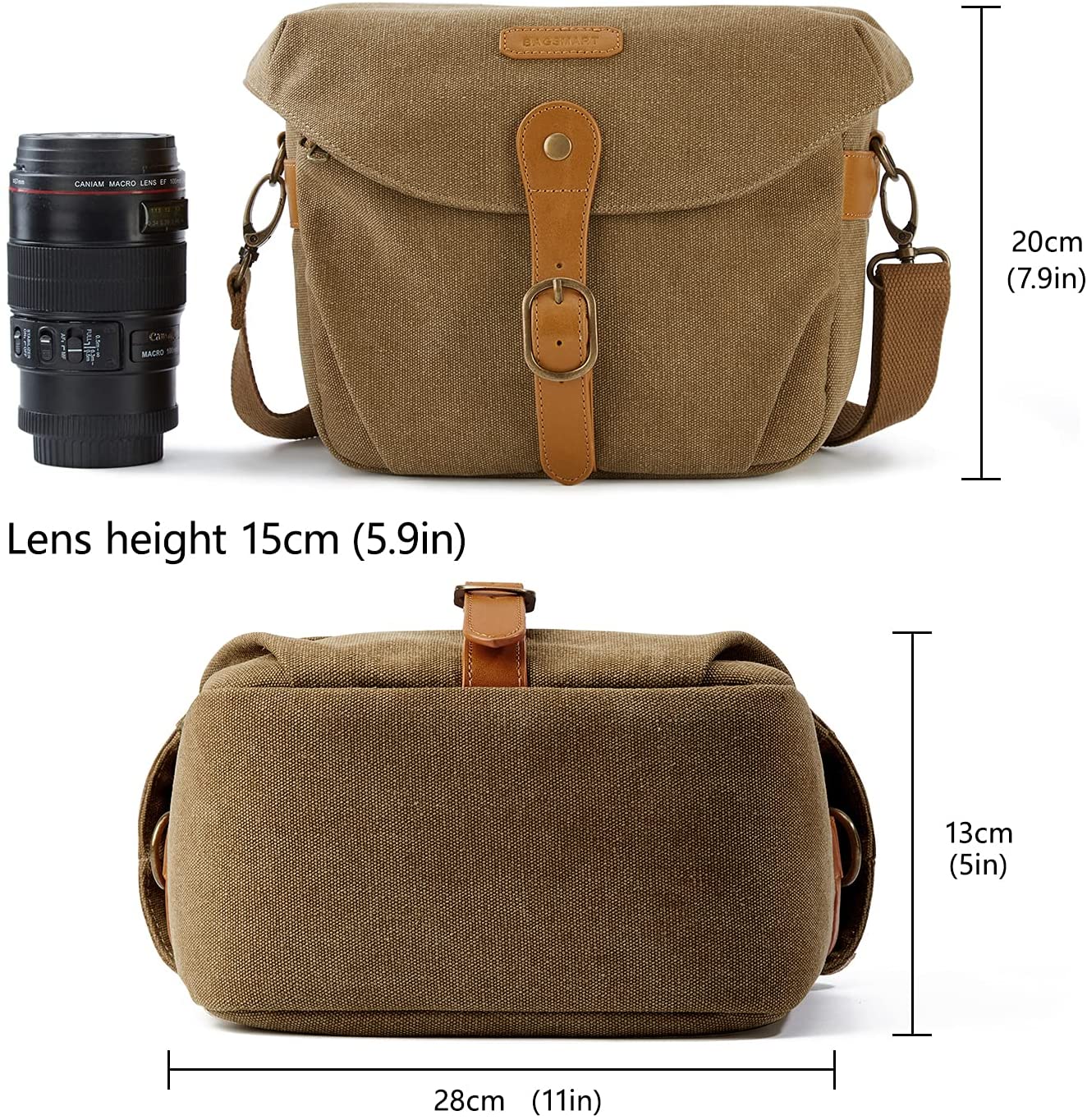 Perfect Size Camera Bag – Dimensions: 11″L x 5″W x 7.9″H. The main compartment for 1 DSLR plus 1-2 exchange lenses and other camera accessories. The front and back pockets to organize phone, batteries, lens cap, SD cards, cable, ect. Customizable Space – Two removable padded dividers to keep camera and lens separated and protected, allow you to customize interior space for different size of camera equipment. Quick Access – The camera case adopts clamshell-style opening, you can quickly open the DSLR camera bag to take out the camera soon. So that you won’t miss those wonderful moments. Keep Camera Safe – Camera case made of waterproof and durable vintage canvas. The thickened padded of interior and the flap on top work together to protect camera gear from bumps and shock. Includes a rain cover to protect the camera from unexpected weather. Stylish Camera Shoulder Bag – Perfect for a day trip or travel and offers practical features for the photographer. Detachable, adjustable padded shoulder strap will provides comfort and versatility. The trolley strap at the back for attaching your suitcase while traveling to free your hands. Detach the interior dividers, you can easily convert it into a stylish everyday shoulder bag.