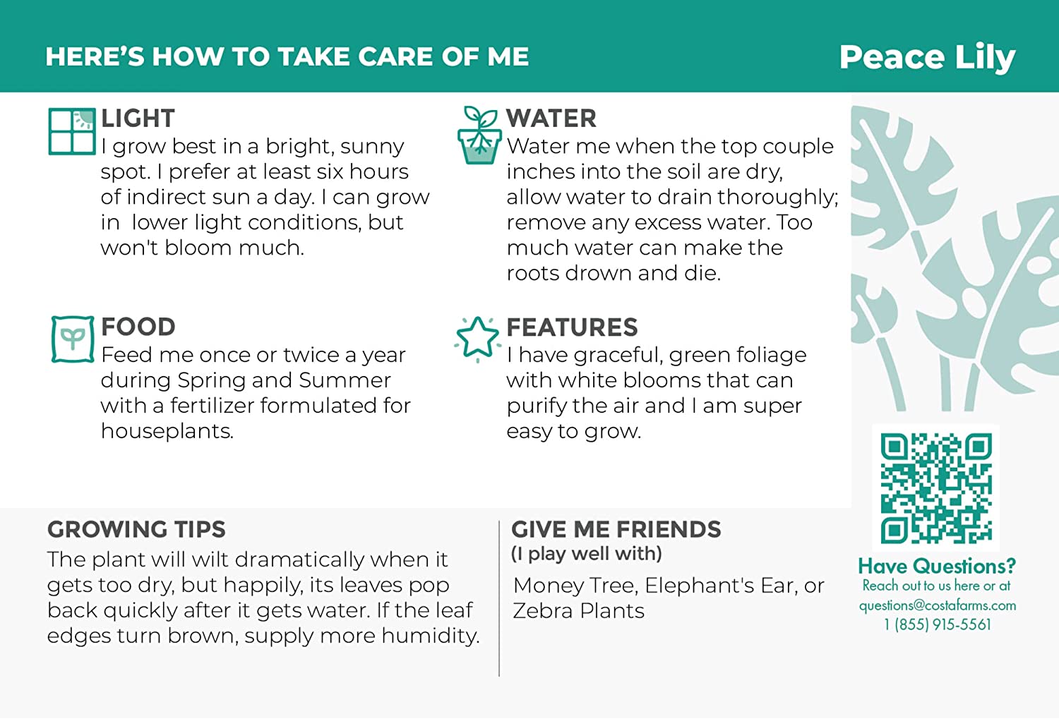 Peace Lily features solid, green foliage. The Peace Lily is great for large spaces. It does well in spaces that have bright, indirect sunlight. Place Peace Lily in a spot that receives bright light (5 or more hours of sunlight). Water your plant about once a week with approximately 2-3 cups and be sure all excess water drains away. Adjust as needed for your environment. Do not let the Peace Lily sit in water or overly soggy soil. The height at shipping is approximately 24-inches tall, measured from the bottom of the pot to the top of the plant. The Peace Lily ships in a natural-white, 10-inch seagrass planter. To avoid water spillage, this container does not have holes. The Peace Lily is a moderate grower. Exact growth rate depends on the care provided and its environment. Give it a boost during the warm months of Spring and Summer with a general-purpose fertilizer that is formulated for potted plants. Follow the instructions on the fertilizer package for the best use. When the plant out grows the current container, it is time to repot. To repot the Peace Lily, gently remove it from its current container and place it into a slightly larger container. Fill in any empty spaces with new and fresh soil and water thoroughly. This plant is considered hardy in USDA Zone 10b-11. Be aware of third-party sellers; other companies try to imitate our quality. There are no other authorized Costa Farms sellers. Look for ships from & sold by to ensure you’re getting our premium plants. Plants are living things; each one is slightly different, so the plant you receive may vary from the photo. Our growers hand-pick the healthiest and highest-quality plants. We package our plants for shipment with great care so they’ll arrive at your home ready to be displayed. Shipped fresh from our farm to you, Costa Farms is passionate about delivering happy, healthy, beautiful plants. Costa Farms plants are not intended for human or animal consumption. Keep out of reach of children and pets. Send us your feedback at questions@costafarms.