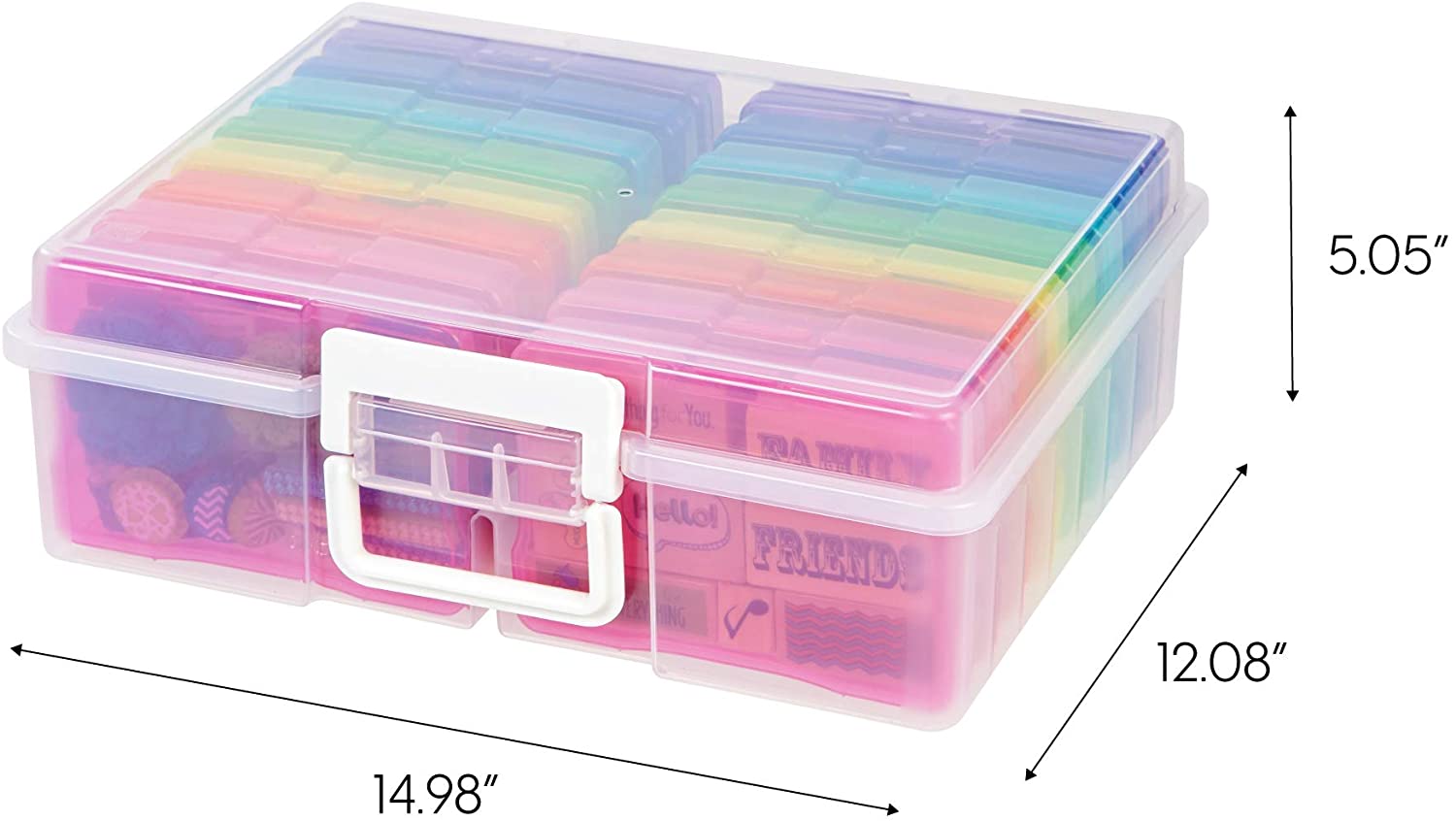 IRIS USA Photo and Embellishment Craft Keeper Sorting photos has never been easier! Each Photo and Craft Keeper holds 16 of 4 x 6 Photo and Embellishment Cases to help organize and protect photos as well as small craft items including stamps, stickers, and embellishments. The snap-tight closures keep the contents secure, while rounded corners prevent damage. Lid design allows for stacking multiple cases. The in-molded handle makes it easy to transport your photos or craft items wherever you go. Made in the USA. BPA, acid, PVC, lignin free.