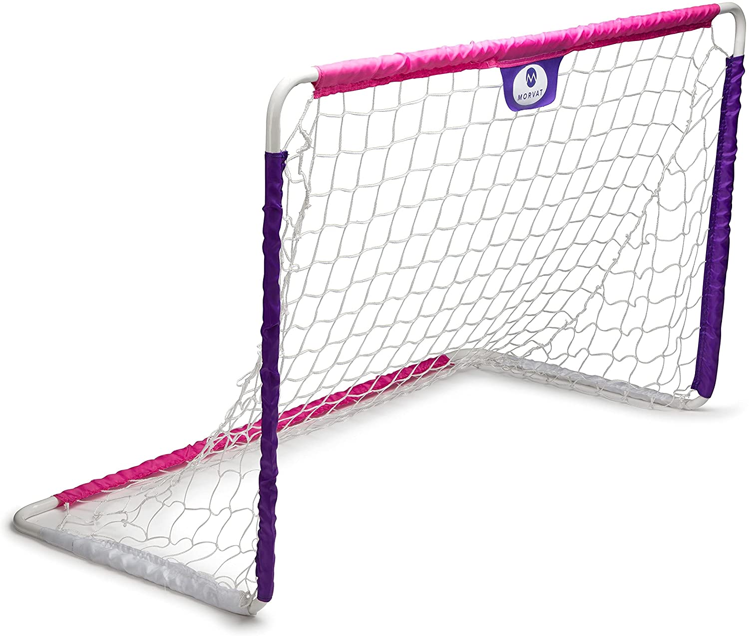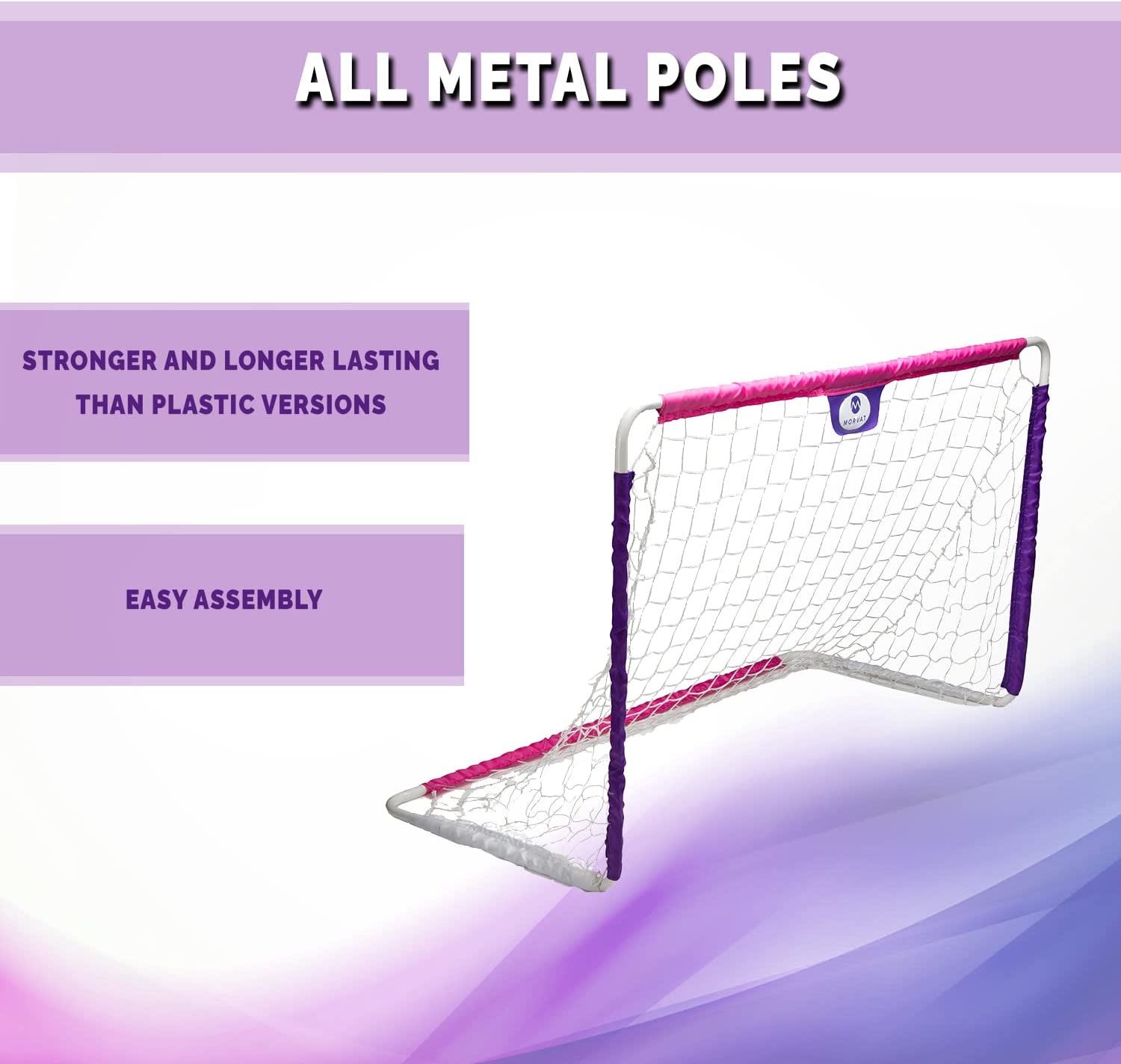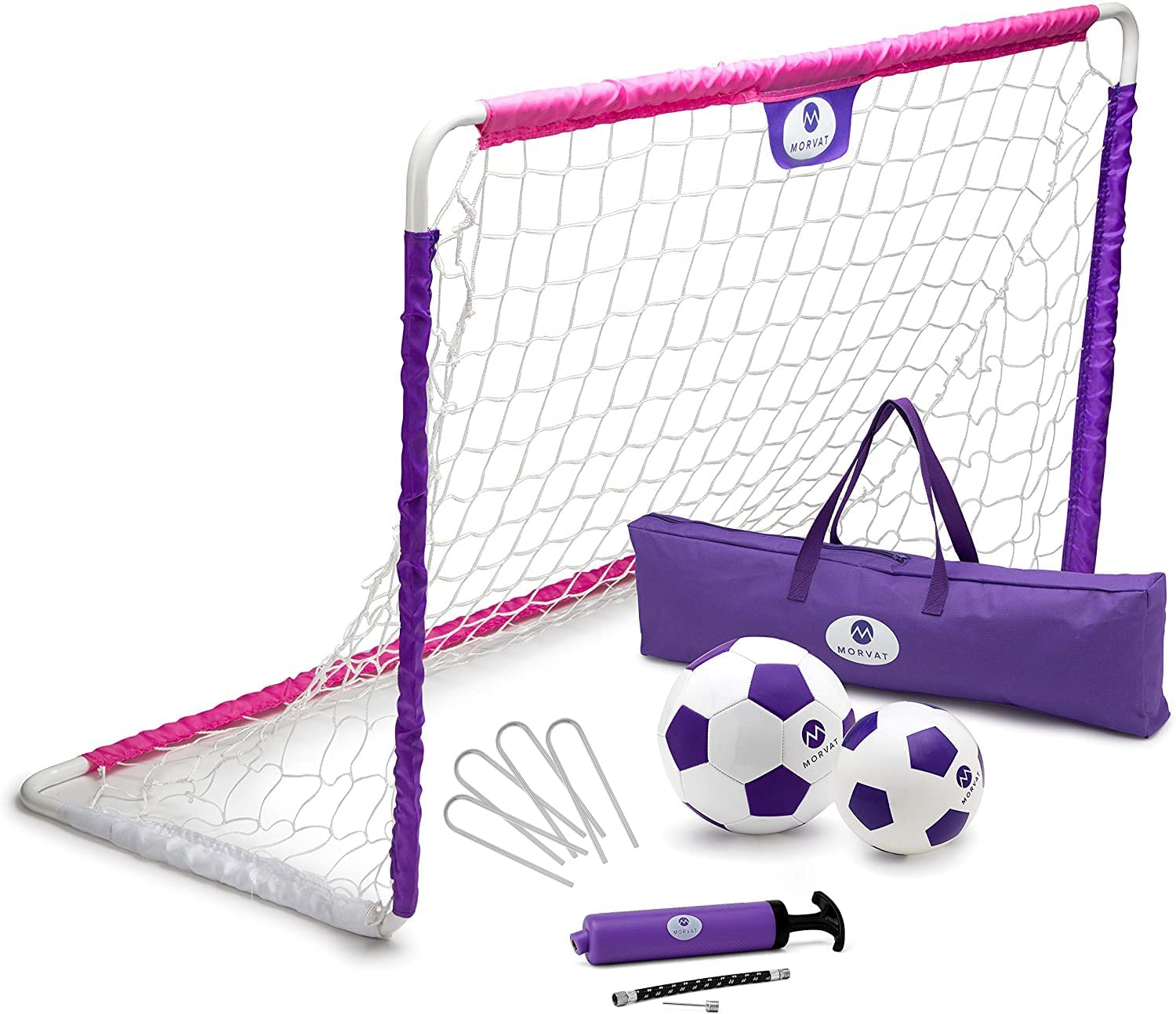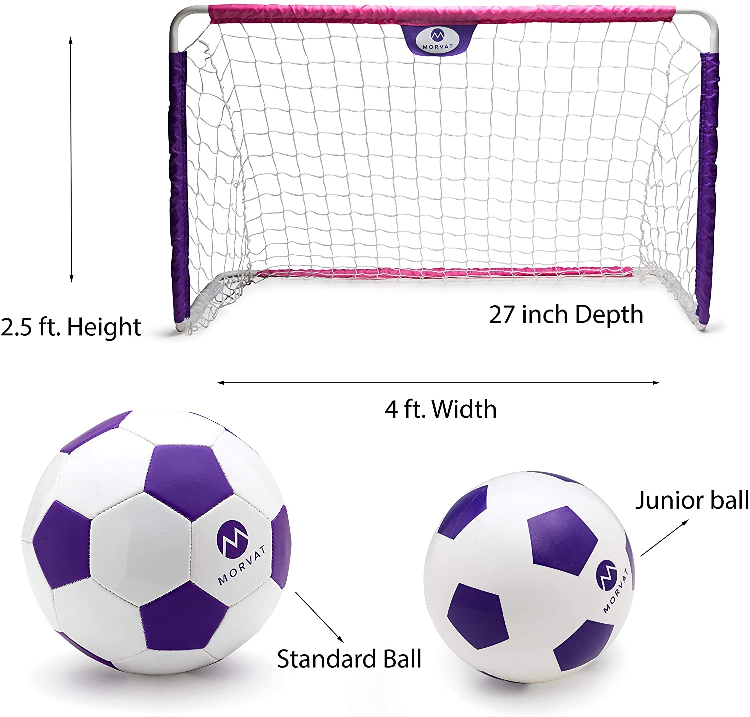 INCLUDED IN THE SOCCER BALL SET- Kid soccer goal post with purple/pink soccer ball net (size: 4 ft x 2.5 ft), pump with needle, two soccer balls – standard and junior sizes for all age children, four metal spikes – to help hold soccer net in place, and carry bag – for easy transport. MADE WITH ALL METAL POLES- Morvat’s outdoor toddler soccer set is made to be stronger, tougher and more durable than any other on the market. Plus, assembly is easy with no tools required- your kids can probably do it themselves! DEVELOP VALUABLE SKILLS – This Morvat soccer goal for backyard set is a great way to teach kids the basics of soccer while helping them to improve coordination, motor skills and social skills. INCREASE YOUR KIDS EXERCISE- Toddlers and children will love playing with this toddler soccer net and will keep themselves busy for hours! 100% MONEY BACK- We want every customer to be completely satisfied with our toddler sports toys. If you are not completely satisfied, we will give you a replacement or a refund. So “Add to Cart” now- risk free!