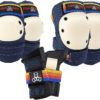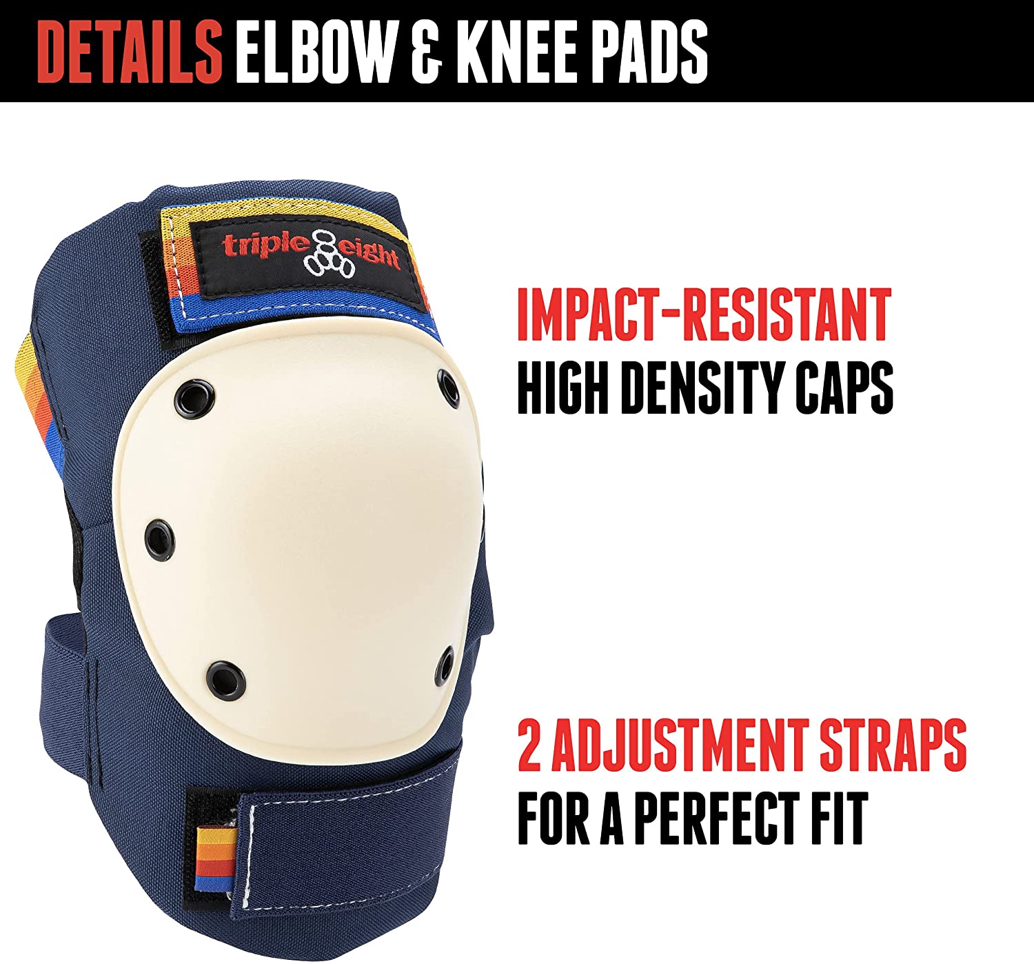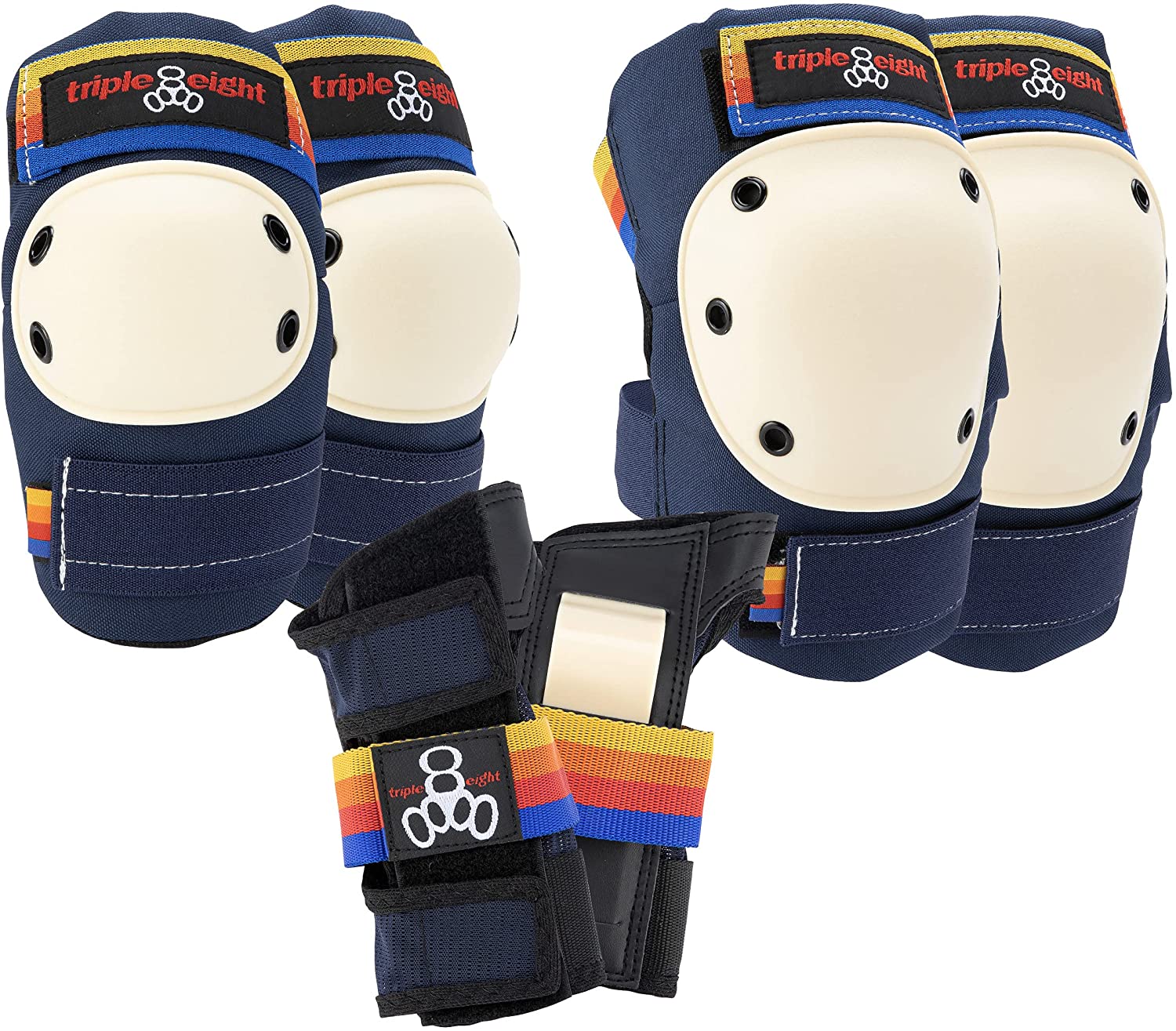 Triple 8’s Saver Series Pad Set includes one pair each of Kneesaver Knee Pads, Elbowsaver Elbow Pads and Wristsaver Wrist Guards, packaged together in a convenient skateboard pad set. Knee pads and elbow pads are ergonomically designed, and are made of high grade durable fabrics, with EVA foam padding, and polycarbonate full coverage caps for superior protection that won’t restrict movement. The wrist guards offer rigid support and protection with high-density, impact-resistant molded ABS splints and tough 4-way stretch nylon mesh for a snug fit. Ideal for skateboarding, biking, roller derby, and inline skating (roller blading), all pads feature an easy on-and-off sleeveless design and wide, reinforced elastic straps with adjustable hook and loop closures that ensure a secure fit. The Triple Eight Saver Series Pad Set is available in four sizes to fit kids, youth, and adults (size determined by wrist guard; measure around the hand at knuckles): Junior fits 6.0-7.0 inches, Small fits 7.0-8.0 inches, Medium fits 8.0-9.0 inches, and Large fits 9.0-10.0 inches. Manufacturer..