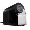 - Electric pencil sharpener with SafeStart motor stops shaving when the bin is removed